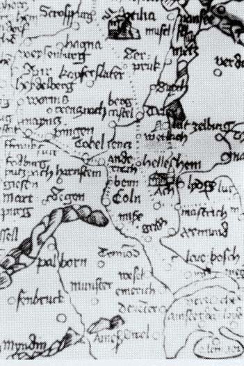 Aus den Niederlanden kommen zwei Pilgerwege: Der westliche aus Belgien führt über Maastricht, Aachen, Hillesheim, Wittlich nach Trier und weiter über Saarbrücken an den Oberrhein; der östliche aus Holland verläuft über Geldern — Köln — Koblenz den Rhein entlang bis Worms und biegt dann nach Ulm ab. Bemerkenswert ist, daß die Karte zum ersten Mal Orte in der Eifel selbst bringt: Hillesheim und Wittlich. Sie müssen demnach wichtige Etappenstationen des westlichen Pilgerweges gewesen sein, wie sie ja später auch noch wichtige Umspannstationen für die Pferdepost waren.