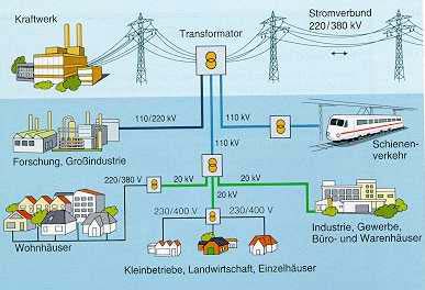 In den Umspannwerken wird die Spannung von 110 kV auf die Verteilspannung von 10 kV oder 20 kV umgespannt.